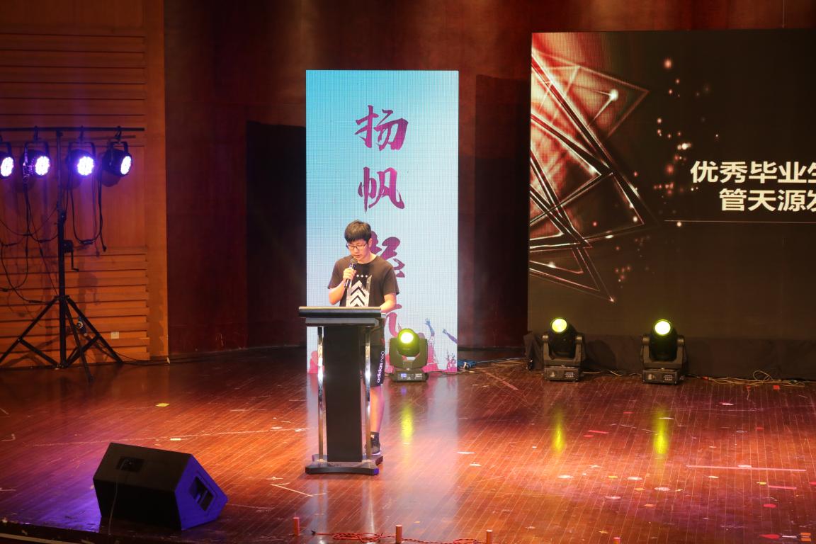 此次晚会由礼仪队热烈的开场舞《daddy》拉开帷幕。首先发言的是周宏明院长,他表达了对麻豆视频 毕业生殷切的盼望和美好的祝福。接着,优秀毕业生代表14卓工一班管天源的发言表达了对于过往四年的怀恋以及对于未来的希望和对母校的感谢。在管天源同学发完言后,毕业班代表们为班主任献上了一束束鲜花。随后,黄沈权老师作为毕业班班主任代表发言。他的话语中饱含着对于学生的留恋和祝福,诚挚的希望他们日后能成就一番事业。在同学们和老师们发言过后,主持人宣布了一系列获奖名单,由周宏明院长、周荣书记等麻豆视频 领导为获奖学生颁奖。