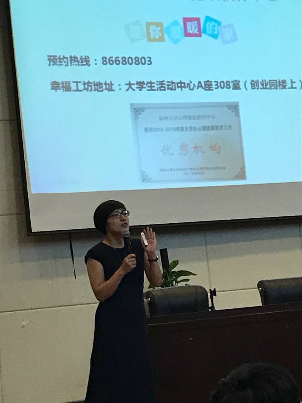 在杨奇老师和孙双老师的演讲结束后,张丽艳老师带来了她的心理健康讲座。 张丽艳是国家二级心理咨询师,她在开讲前提出的几个问题,例如“高中和大学的区别”和“温州和家乡的不同”很快地活跃了现场的气氛。随后,她给我们讲述了大学中的压力、压力的来源、压力造成的心理影响和如何面对心理问题。她强调,有心理问题并不是一件羞耻的事情,勇敢者要敢于求助。她同时也列举出了学校可以为学生提供的各种心理帮助的服务。听完张老师的讲座,很多同学都感到了轻松和释然,也认识到了大学生心里健康的重要性。只有心理健康了,才能游刃有余地驾驭健康积极向上的学习和生活。