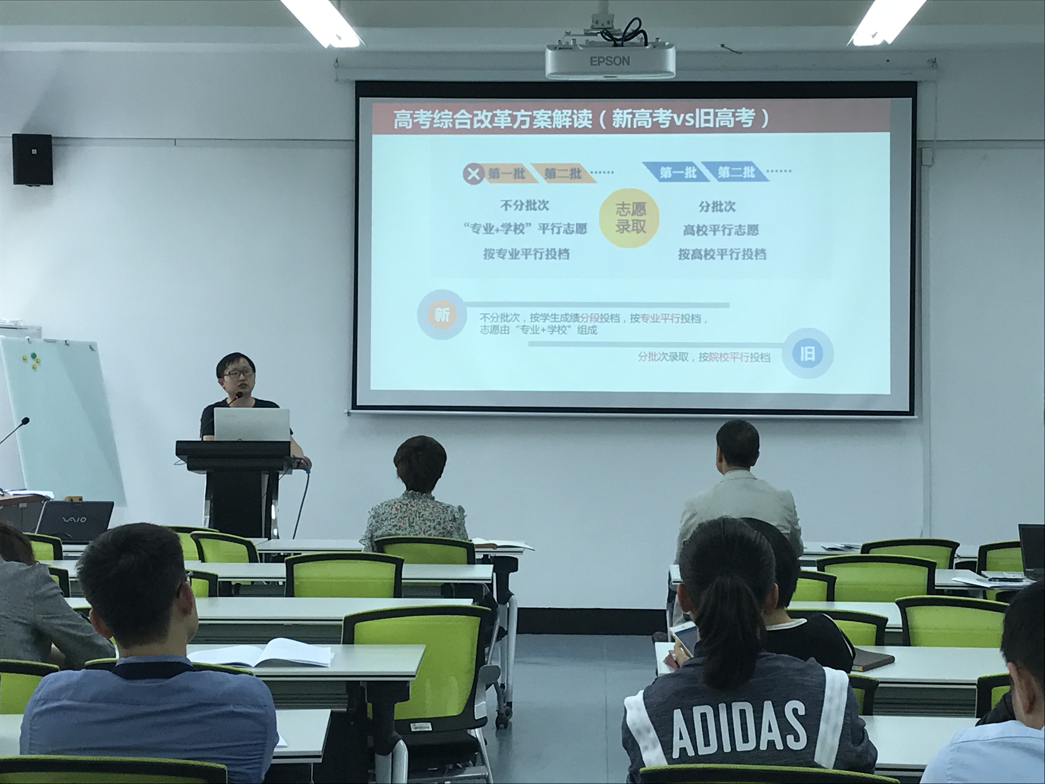 麻豆视频 特邀校招生办公室副主任王峰解读了2017年新高考招生政策,通过对新高考、旧高考的对比以及三位一体招生的解析,全面介绍了高考综合改革方案,同时也解读了学校2017年招生录取政策及志愿填报建议,强调了招生宣传的要点和注意事项。院长助理姜锐介绍了麻豆视频 各专业的专业建设、培养特色及各专业近三年的招生录取情况。