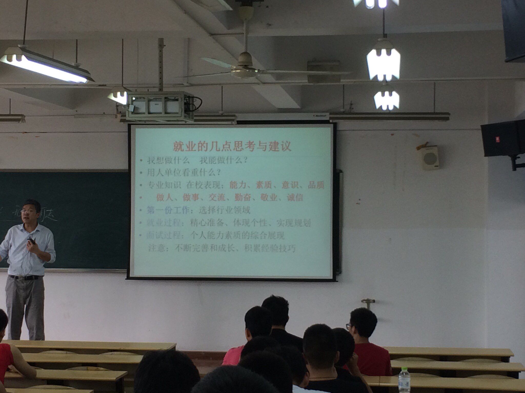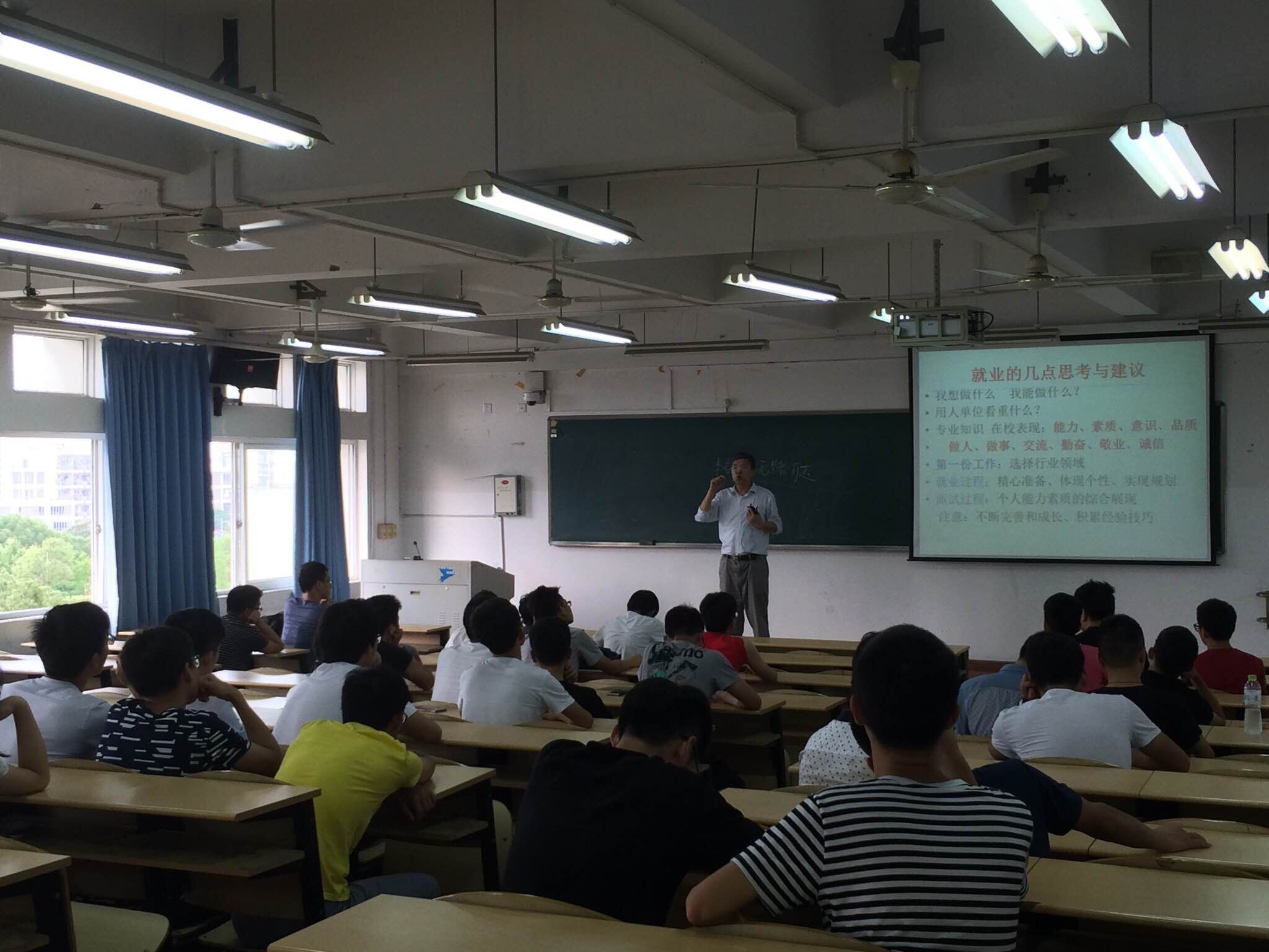 冯老师从“我这一生该如何度过?未来我最理想的状态?”两个问题入手,启发学生对自身的思考,引导学生转变原有的“金饭碗、铁饭碗”等思想观念和思维模式,不断从广泛领域中学习、创新的方法、技巧、能力、素质和意识;就业是个人综合素质的体现,需要不断完善个人,积累经验和技巧。