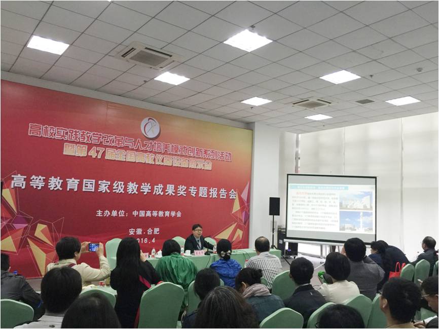 2016年4月26日至29日,由中国高等教育学会主办的高校实践教学改革与人才培养模式创新系列活动暨第47届全国高教仪器设备展示会在安徽合肥召开。来自教育部和各省市教育行政部门相关领导、全国高等学校院系领导、学科负责人等150余人参加了本次系列活动之高等教育国家级成果奖专题汇报会。我校麻豆视频 周宏明院长受邀代表温州大学在会上作题为“面向中小企业的地方本科高校应用型人才培养探索与实践”的报告。
