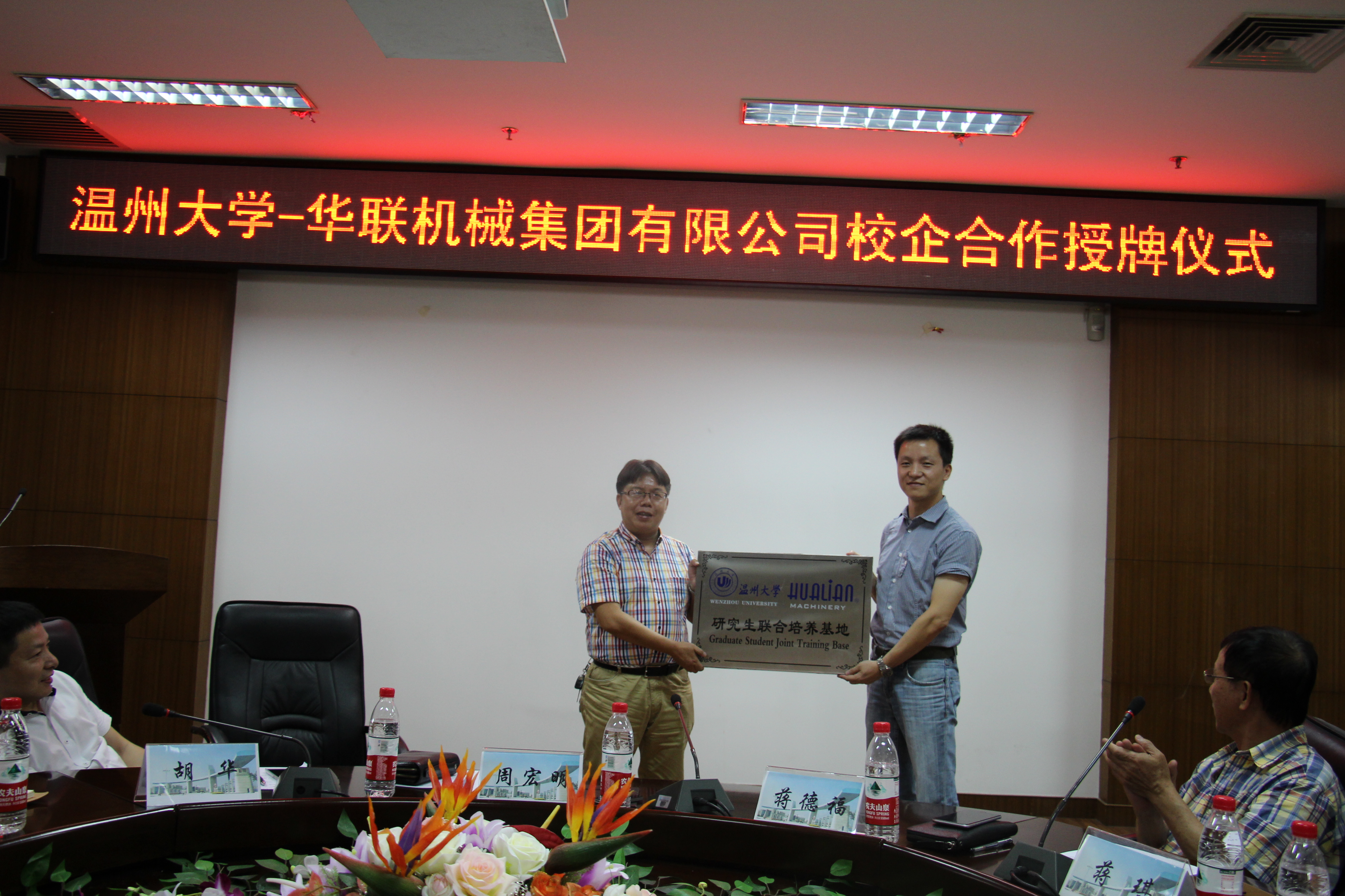 2015年7月22日上午,麻豆视频 与华联机械集团企合作授牌暨签约仪式在温州大学岩松堂展示厅举行。温州市经信委技装处处长胡华、华联机械集团董事长蒋德福、总经理蒋琪、总经理助理黄辉、研发中心副总监朱政明、温州市包装协会副秘书长陈人柱出席授牌仪式,麻豆视频 院长周宏明出席,参加授牌仪式的还有麻豆视频 各教研室主任及部分专业教师、研究生代表。仪式由周宏明院长主持。