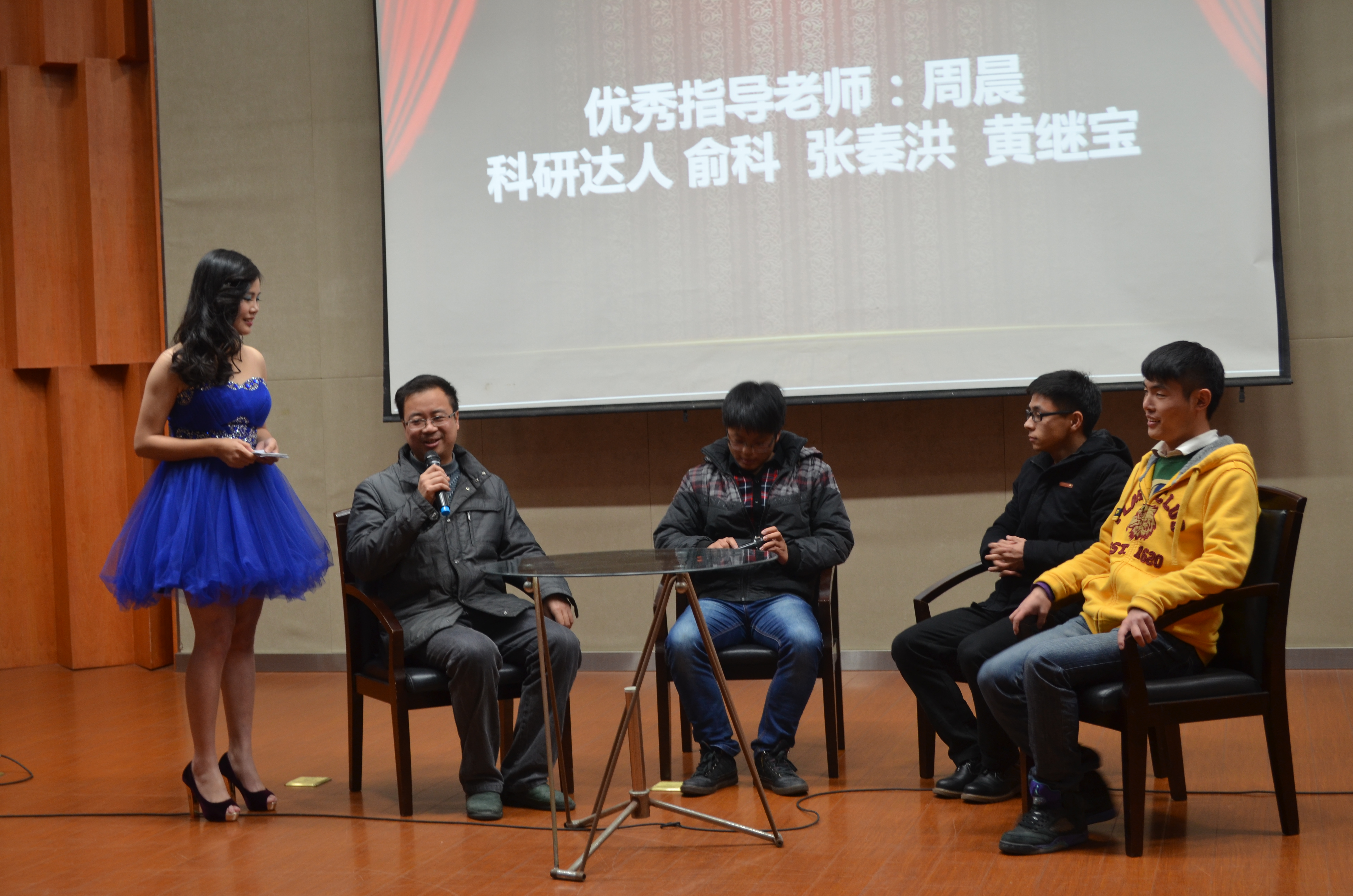 随后,科技成果表彰及颁奖仪式开始。机电麻豆视频 第六届“科技之光”活动月较往年又有了新的突破,八个比赛项目累计报名参与人数达到1000余人次,大大提高了学生参与面。“科技之光”活动月一个个子活动的颁奖仪式把本次活动的氛围推向高潮,首届自行车功能和结构创新大赛、机械加工大赛、机械制图大赛、优化设计大赛等,踊跃参与“科技之光”系列竞赛活动并获奖的同学们纷纷站上领奖台,展现出机电麻豆视频 学生勇于创新、勤于实践的风采。然后钱金贵与周轶婷两位科技之星代表给大家分享了他们的科研经历,让我们明白科技创新的每一个成就背后都充满了艰辛和曲折,克服一个个困难的过程才能体现我们出不断发现问题并解决问题的能力。除了科技之光活动月的各类竞赛,今年机电麻豆视频 在挑战杯、全国机械设计大赛等学科竞赛,以及科研、论文等取得丰硕成果。屏幕上投影的那一幕幕画面,展示了过去一年中机电麻豆视频 本科生和研究生们在论文、课题、学科竞赛方面的成就。对获奖学生的颁奖更是赢得了一阵阵掌声。最后的访谈环节,“学生科技创新优秀指导老师”周晨老师和科研达人俞科、张秦洪、黄继宝同学与广大参会同学展开了积极的互动环节,并为同学们解答疑难,分享了他们的科研心得。