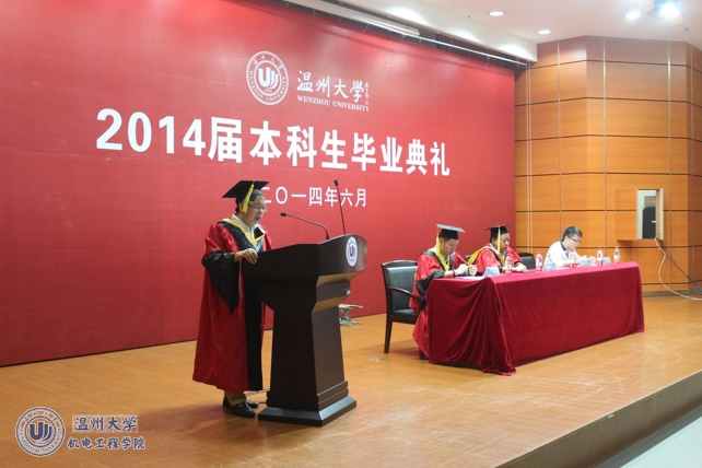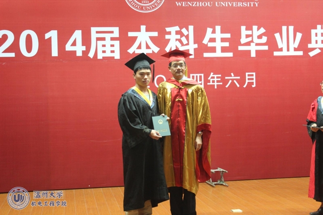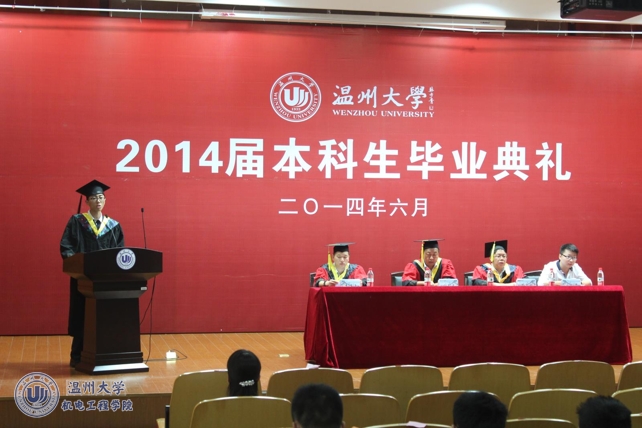 10机自本二班的陈鹏飞同学代表毕业生发言。他表示,未来的人生路上,毕业生们必将牢记自己人生的履历表上有着温大的印记,牢记‘求学问世,敢为人先’的校训,努力做一个睿智勇敢、勇于担当、胸怀大志而又脚踏实地的温大人。