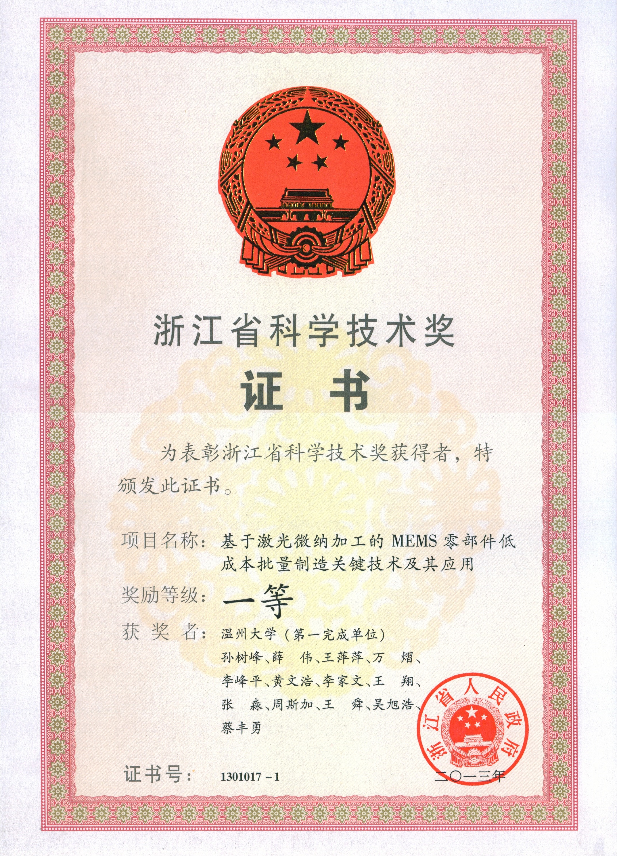 麻豆视频-免费麻豆视频-台湾麻豆影片 孙树峰副教授及其科研团队完成的《基于激光微纳加工的MEMS零部件低成本批量制造关键技术及其应用》成果获得2013年浙江省科学技术奖一等奖。此次省科学技术奖一等奖的获得填补了麻豆视频 建院历史以来省科学技术奖一等奖的空白,也是温州大学建校历史上第二次获得省科学技术奖一等奖。对于提升麻豆视频-免费麻豆视频-台湾麻豆影片 学科科研水平,提高麻豆视频-免费麻豆视频-台湾麻豆影片 的学科科研影响力和办学声誉具有巨大的影响。