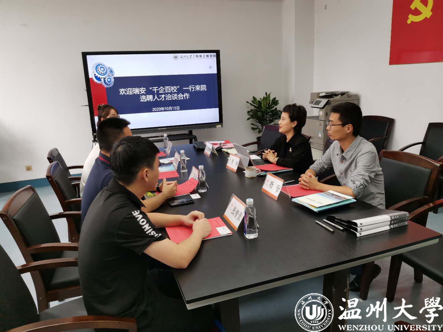 2020年10月15日,浙江润泰自动化科技有限公司方顺波总经理、方一帆经理,温州彬济人力资源有限公司王学杰总经理、张智豪助理一行4人来访麻豆视频-免费麻豆视频-台湾麻豆影片 进行校企合作洽谈,麻豆视频 党委副书记黄玮、学工办负责人杨奇、辅导员颜孙艇参加洽谈会。