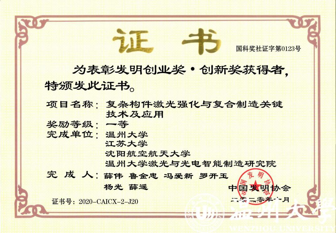 该项目由我校薛伟教授主持,温州大学、江苏大学、沈阳航空航天大学、温州大学激光与光电智能制造研究院等合作完成,主要围绕国家重大战略需求,通过理论计算与试验研究相结合,技术开发与重大工程应用相结合,在高端复杂构件激光冲击强化与复合再制造理论、关键技术和成套装备等方面取得了一系列创造性成果。理论突破了我国航空发动机领域一直存在的复杂构件激光强化和再制造难题,填补了国内空白。目前部分指标已经达到国际领先水平,被广泛应用在航空发动机、大飞机、汽轮机、重型机械和汽车零部件抗疲劳制造和再制造领域,引领着我国高端构件激光强化和再制造行业技术进步,提升了我国的国际竞争力。其中高端复杂构件激光冲击强化与复合再制造理论、关键技术和成套装备等获得发明专利47件,SCI论文被美国工程院院士、中国科麻豆视频