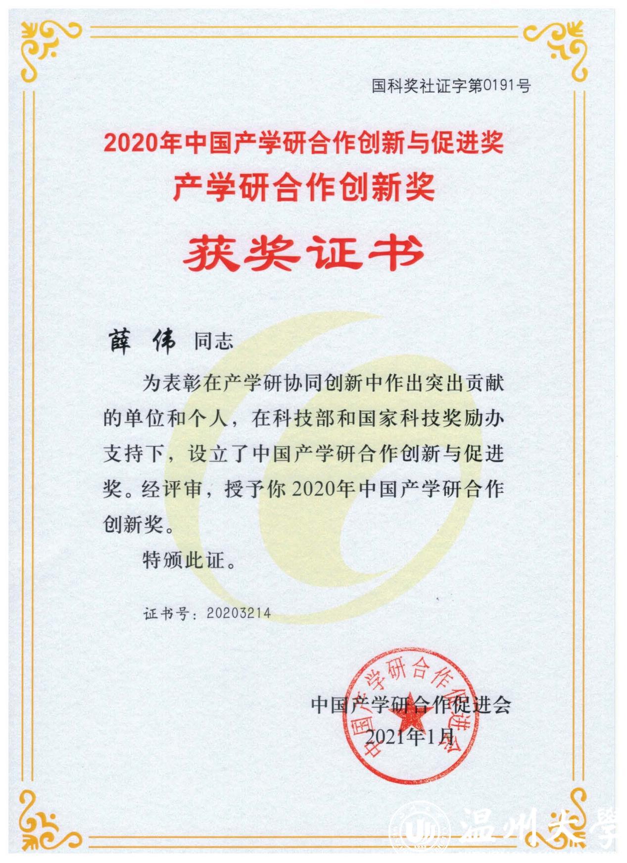 据了解,发明创业奖于2005年由国家科技部批准,由中国发明协会设立,旨在调动群众发明创业的积极性,增强全社会的创造活力,促进发明成果的转化实施,为大力推动自主科技创新奠定雄厚的社会基础,为建设创新型国家做出贡献。产学研合作创新奖是中国产学研合作创新与促进奖之一,是我国唯一面向产学研协同创新的最高荣誉奖,具备向国家奖励办择优推荐国家三大科技奖项资格,每年仅评选一次。这两项荣誉的取得,标志着薛伟教授团队在产学研合作创新工作中又迈上了一个新的台阶,将为温州“一区一廊一会一室”和“重要窗口”建设添砖加瓦。