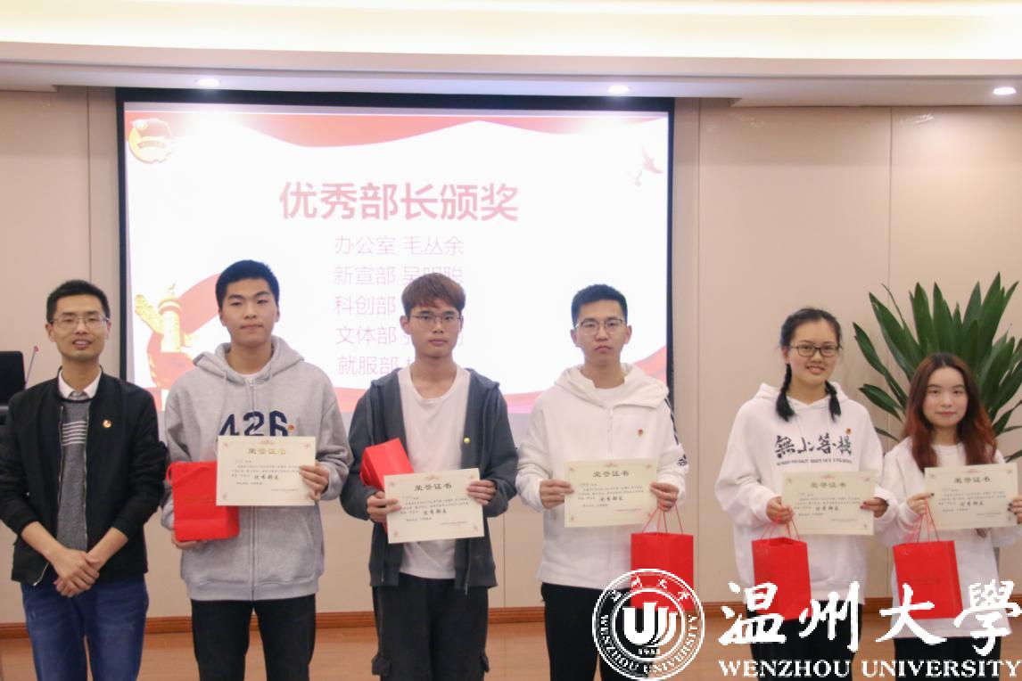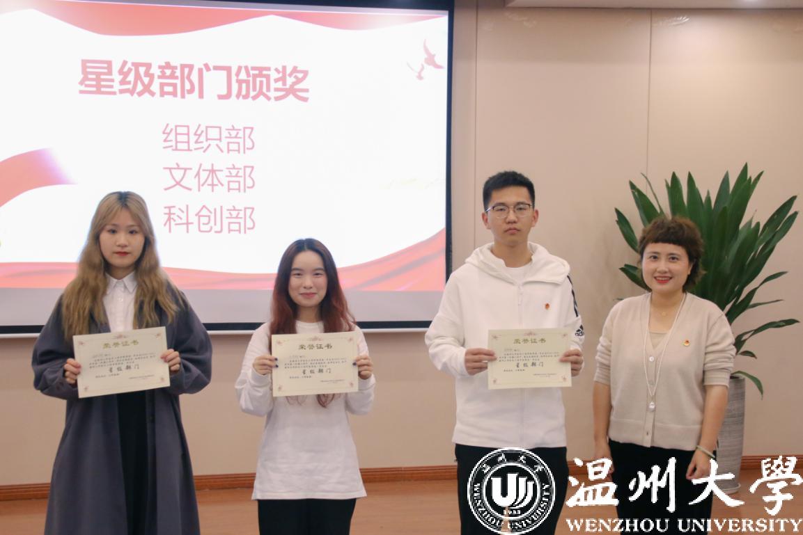 麻豆视频 党委副书记黄玮,学工办全体辅导员以及团委·学生会全体成员参加本次大会。大会在嘹亮的中国共青团团歌《光荣啊!中国共青团》歌声中拉开帷幕。首先,对上学期工作中,表现积极,工作突出的集体及个人进行表彰,鼓励引导广大学生干部“不忘初心、牢记使命”,在新的学期中继续努力,取得更加优异的成绩。