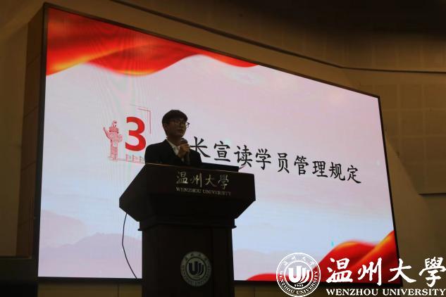 本期培训班班长金舒阳同志宣读《中共温州大学委员会党校分党校(联合)学员管理办法》,明确培训期间的纪律问题,希望学员们严格遵守,身体力行,为成长为一名合格的共产党员而努力!