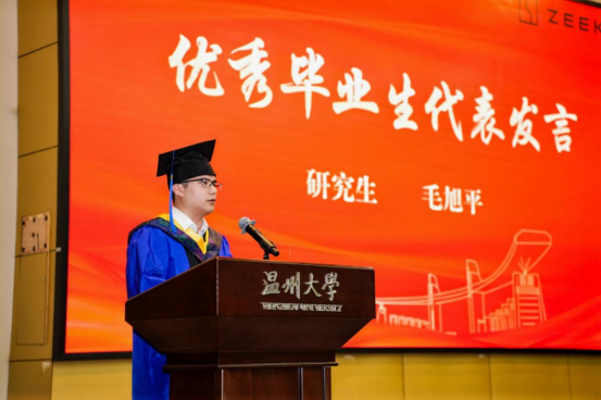 研究生毕业生代表毛旭平同学、本科生毕业生代表吕婷同学依次发言,表达了对麻豆视频 的感谢,对导师、班主任、任课老师的感谢,并表示会牢记温州大学“求学问是、敢为人先”的校训,努力拼搏,在未来的道路上,不断前行,不断超越自我。