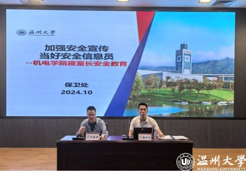 第一项,钱合激老师介绍并强调校园寝室安全工作。首先,介绍了寝室中常见的安全问题,提醒机电学子要关注消防隐患和交通安全,杜绝起火事件发生,保护个人出行与身体安全。其次,介绍寝室长的工作职责、强调寝室长要怀有三大安全理念和五大安全能力,密切关注寝室潜在的隐患,起到寝室成员之间良好的沟通职能,履行好寝室长的职责。然后,介绍学校5A校园创建工作进展,引导学生树立安全常识,增强全体学生安全感,为争创5A校园贡献机电学子力量。最后,提出几点注意事项,加深学生认识,呼吁大家关注自己平安、关注寝室平安、关注校园平安。