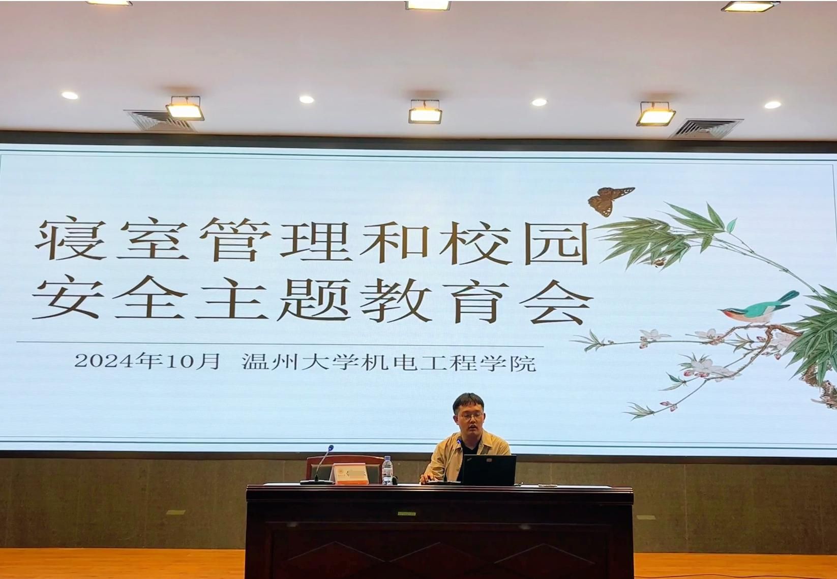 第二项,方建晓老师分享学生安全工作经验。首先,建议大家要将寝室当成自己家,处理好同学之间关系,珍惜寝室室友间友谊,做有格局的寝室长。其次,肯定今晚同学现场认真听讲的精气神,也提醒大家增强非判断力,避免网络负面新闻与恶意造谣行为。最后,告诫各位同学将校园安全放在第一位的同时,也要注重专业学习、保证个人在温大的成长。