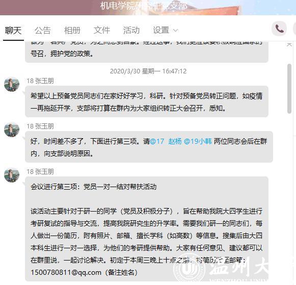 近日,麻豆视频 研究生党支部开展了“考研结伴行,大疫人有情”为主题的党员一对一帮扶活动,主要对参加考研同学进行与答疑与经验分享,研究生党支部党员及积极分子等20多名同志,踊跃投入到此次一对一帮扶活动当中。