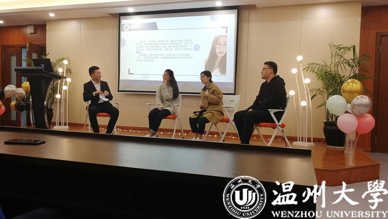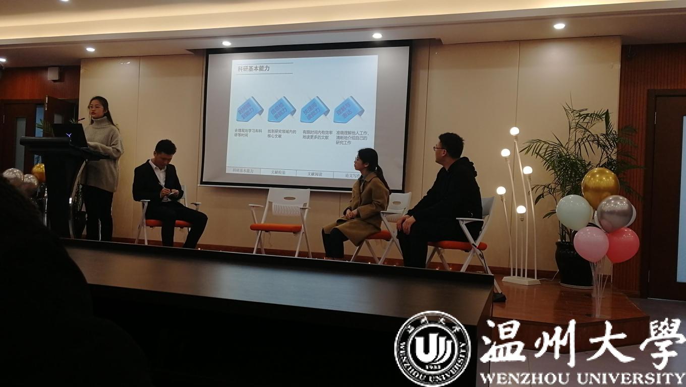 12月19日,麻豆视频 成功举办2019年优秀学子学术经验交流会。交流会邀请到浙江省“十佳大学生”、新加坡南洋理工大学在读博士龚玲艳,17级刘琨、潘俏菲、高闯分享了各自的学术经验。学术分享会吸引了麻豆视频-免费麻豆视频-台湾麻豆影片 众多研究生和本科生前来驻足聆听。