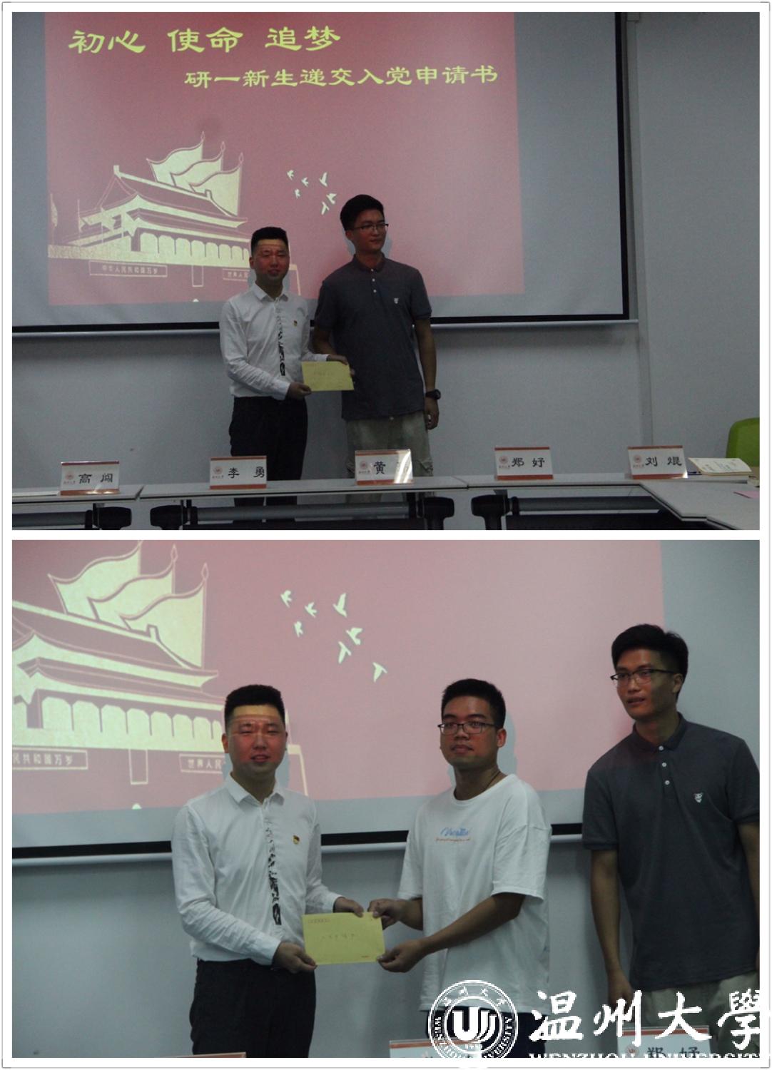麻豆视频 研究生党支部书记、获奖团队成员之一的刘焜同学向我们分享了自从递交入党申请书到现在成为一名党支部的书记的成长经历,他表示党员要起到先锋作用,时刻冲锋在前,一直坚持党员的标准来对照自己,此次参加比赛,困难重重,比赛方案改了又改,但最终都坚持了下来而并没有放弃,依靠的就是一份信念,而这份信念来源就是他加入中国共产党以来的成长经历。刘琨同学的分享给在场的同学们一身正气,在场的同学们更坚定了要积极向党组织靠拢的决心,研一新生黄锦森和曾麟同学在现场主动向党组织递交入党申请书,表达他们想要积极加入党组织的强烈意愿,想早日成为一名有思想有灵魂有本领的社会主义接班人。