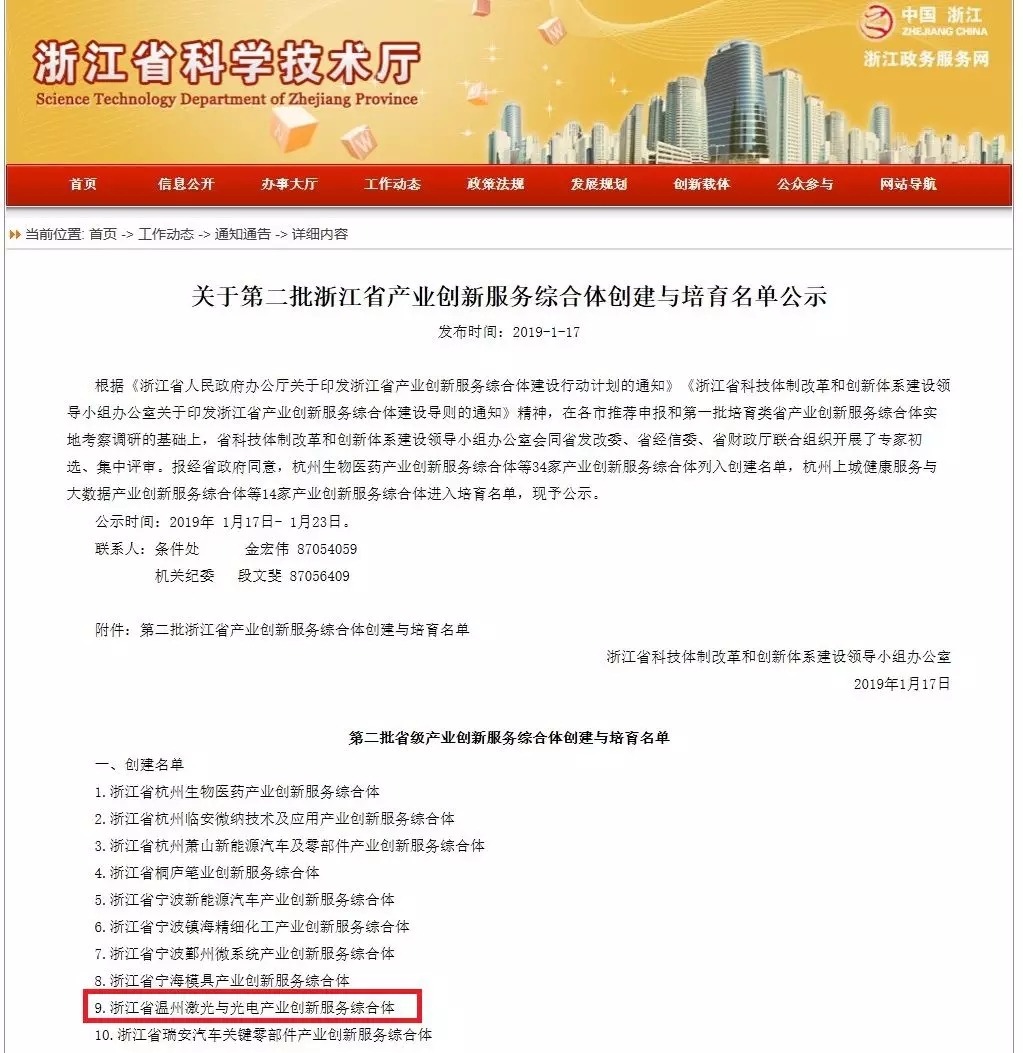 近日,浙江省科技体制改革和创新体系建设领导小组办公室公布第二批浙江省产业创新服务综合体创建与培育名单,温州大学激光与光电智能制造研究院作为核心运营单位的浙江省温州激光与光电产业创新服务综合体列入创建名单。