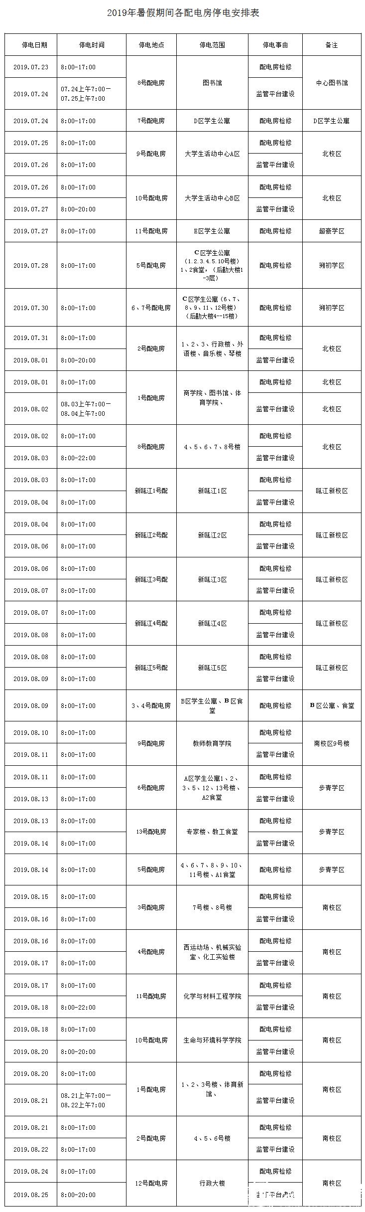 为确保学校电力设施完好,根据国家电网有关规定,学校决定在暑假期间对茶山南北校区、各生活区配电房进行断电检修,并同步进行能源监控平台施工,具体停电计划详见附表。如有不便,敬请谅解!
