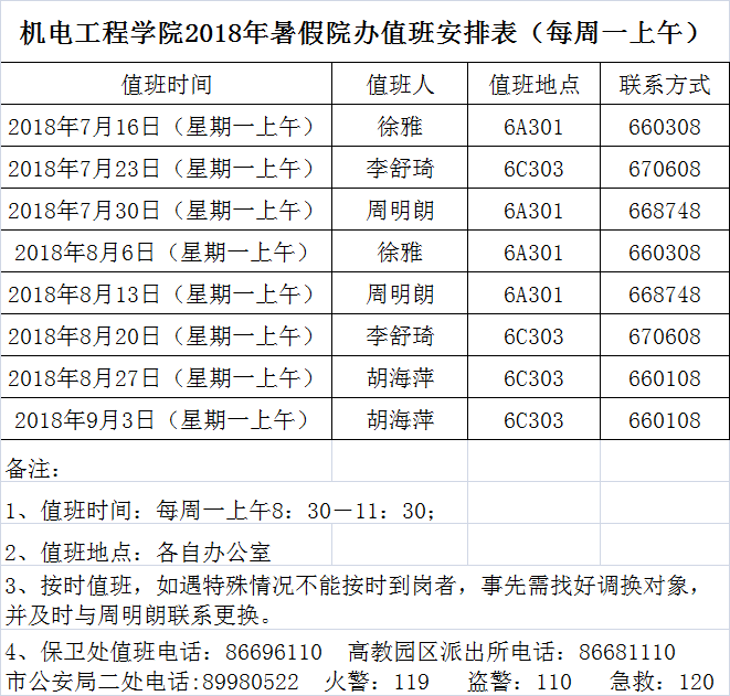 麻豆视频 2018年暑假院办值班安排表