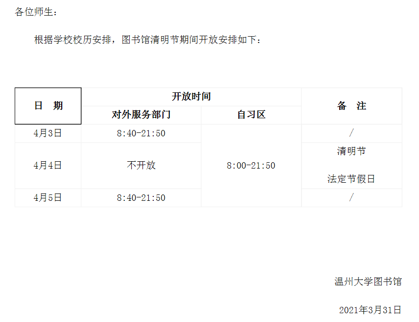 转发图书馆清明节期间开放通知