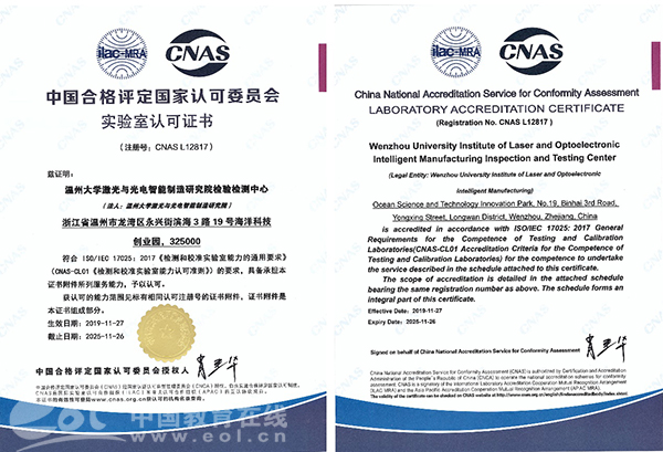 中国教育在线浙江站讯(记者 叶晨曦 通讯员 温大萱)温州大学激光与光电智能制造研究院检验检测中心近日获得了中国合格评定国家认可委员会授予的CNAS认证和国防科技工业实验认可委员会授予的DlLAC认证,具备了作为第三方检测机构的能力,顺利跻身国家认可实验室行列。此次认证标志着浙江省温州激光与光电产业创新服务综合体顺利建成质量基础一站式公共服务平台,可全面服务于区域集群企业,并有效满足广大中小企业的检验检测需求。