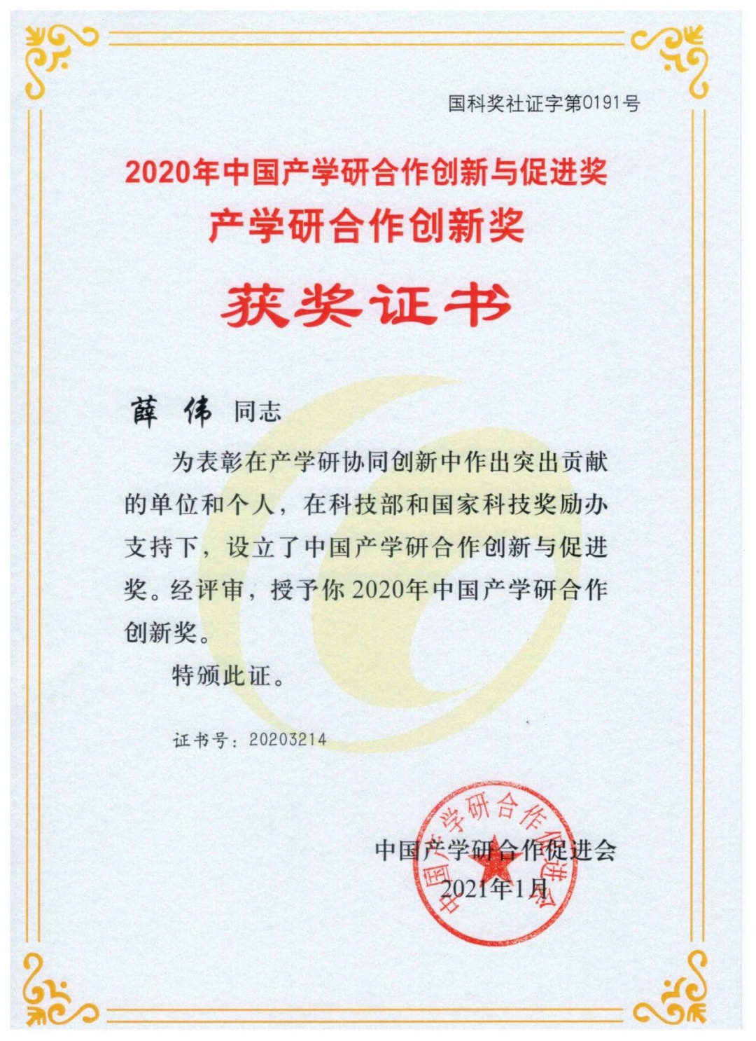 薛伟教授长期致力于激光与光电技术、机械制造工程及自动化等方面的科学研究与产学研工作,主持并参与国家、省级科研项目20余项,授权发明专利70余项,其中2项为美国授权发明专利,发表学术论文百余篇,其中SCI收录论文40余篇,相关成果在企业的应用累计取得了上亿的经济效益,主持或参与的成果获省部级科技奖10余项。此次获产学研合作创新个人奖。
